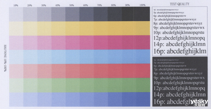 爱普生墨仓式®L6278打印KDY色彩测试样张的效果。白底和反相字母在6p及以上都清晰易辨识,笔画无洇染,字迹锐利,阅读感良好。黑色背景与留白笔画之间界限清晰,打印效果不错。