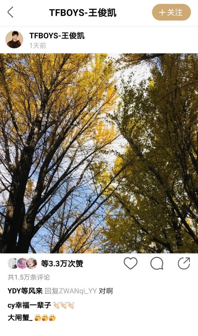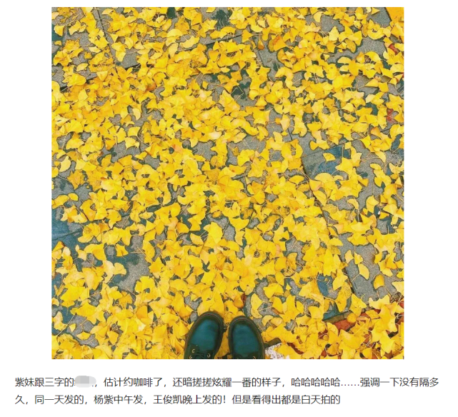 而在王俊凯所发布的照片中,没有任何配文,只拍了些金黄叶子的参天大树。尽管杨紫是在10日中午发的动态,王俊凯是在10日晚上发的动态,两人时间点错开了不少,但是在部分吃瓜群众的臆想之下,仍然觉得两人有事,甚至有网友表示:估计约咖啡了,还暗搓搓炫耀了一番,更有网友直接说到:直觉告诉我,很可疑。