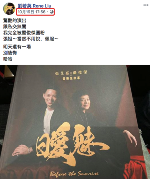 虽然仅是一个背影,但10月19日刘若英在社交动态上发文大赞张艾嘉和严俊杰表现惊艳,如此可见当天刘若英确实有出现在演出剧场。