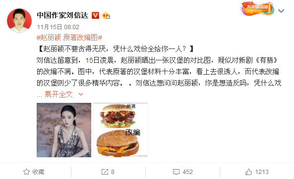 并且还有一个什么作家叫刘信达的扬言要封杀颖宝,还指名说 “赵丽颖不要贪得无厌”, “赵丽颖你如果继续的抱怨的话,继续的误导粉丝的话,就将你的戏份全部删光你又能咋的”听上去很厉害呀!赵丽颖在娱乐圈演戏这么多年,一直都是敬业和职业素养大家也都看到眼里的,这种得不偿失的事情做了也没有任何意义啊。