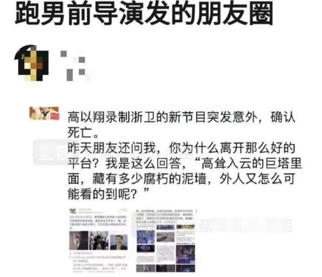 11月27日下午,疑似跑男前导演发的朋友圈在网上曝光,揭示了浙江卫视的暗黑一面。跑男前导演发文称,昨天还有朋友问他为什么要离开浙江卫视那么好的平台。而他的回答发人深思:“高耸入云的巨塔里面,藏有多少腐朽的泥墙,外人又怎么能看得到呢?”
