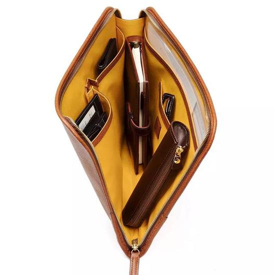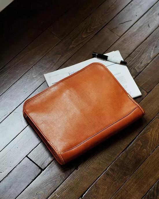 这次推荐的手拿包,有黑色和棕色,选用的是意大利传统工艺的奢华皮革,植物制剂鞣制,整体比较结实,但富有油脂的表面触感舒适。