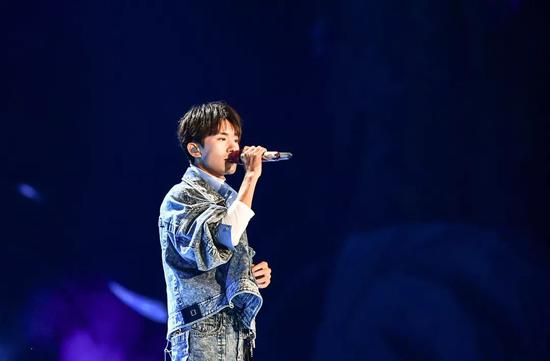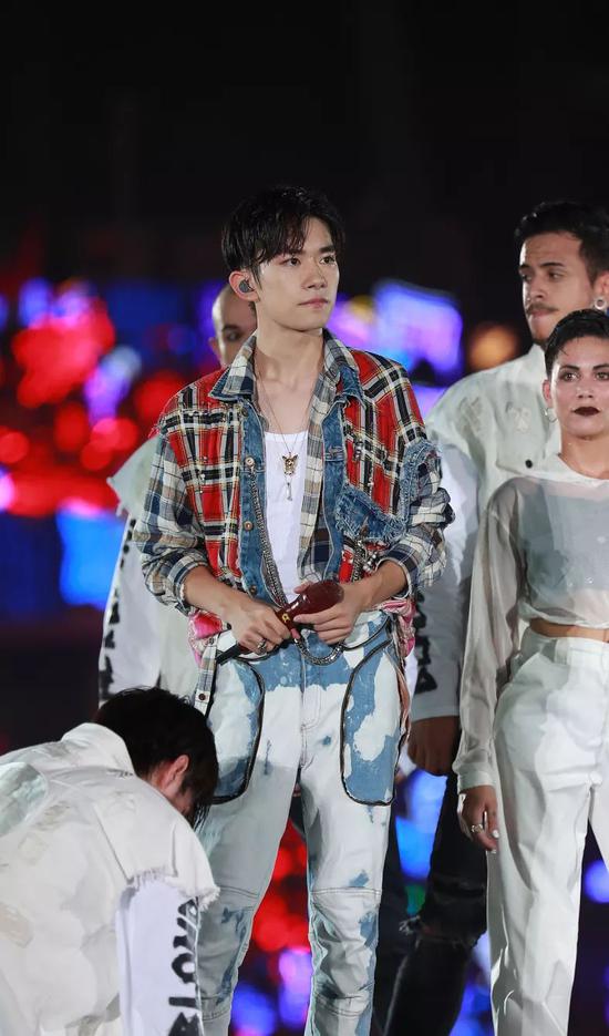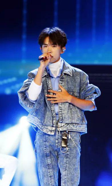在台上唱歌的千玺,用蓝色复古牛仔搭配白色高领衫,还使用了今年秋冬最流行的衬衫叠搭法。你们学会了吗?