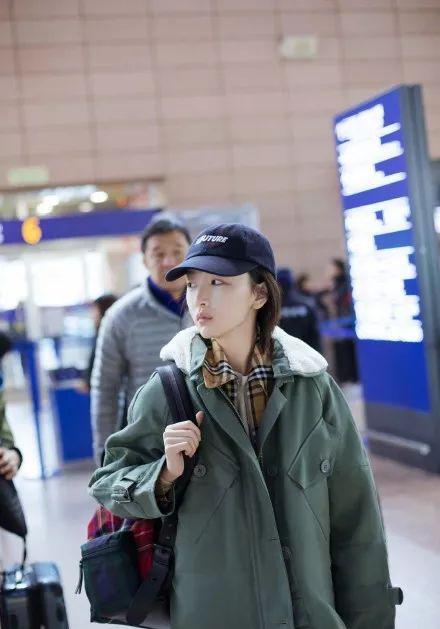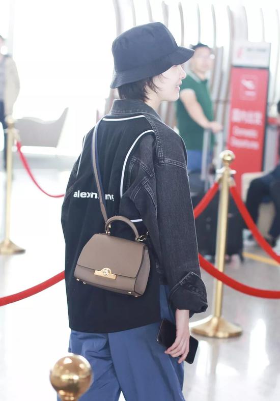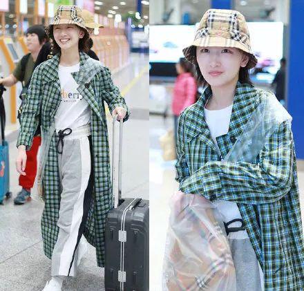 机场造型同样选择格纹风衣和渔夫帽,不同颜色碰撞展现深厚搭配功力。