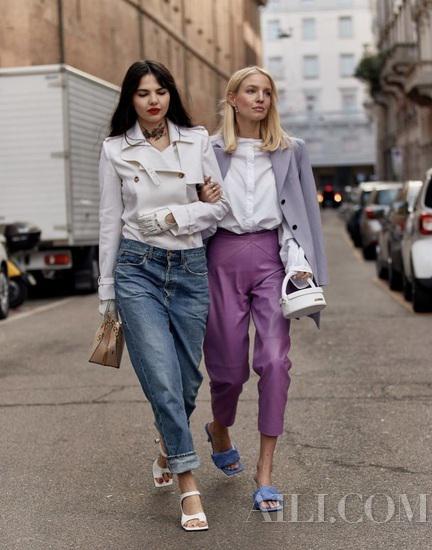 一件白色皮衣与牛仔裤的搭配虽然简单,但效果明显胜于紫色皮裤与白衬衫、西装的搭配,视觉上的减龄效果更佳。