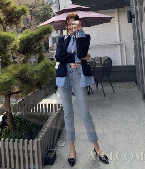 或者在牛仔衬衫外面加一件短外套或者薄开衫,让牛仔衬衫的下摆露出,不显臃肿在上镜方面也很出众。