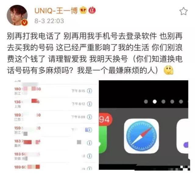 这已经不是王一博第一次被私生饭骚扰了,前段时间,王一博的手机号泄露,粉丝们一直不停地给他打电话,还登陆他的社交软件。严重的影响了王一博的个人生活,至此王一博忍无可忍的发文“恳求大家不要再给他打电话,也不要再用他的手机号登软件了”。