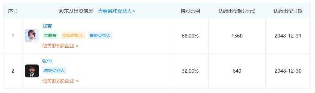 2018年12月23日,郑爽与男友合开公司开发APP应用,郑爽在启动资金上出大头,注资68%,(其中郑爽出资1360万,张恒出资640万)男友张恒任执行董事。